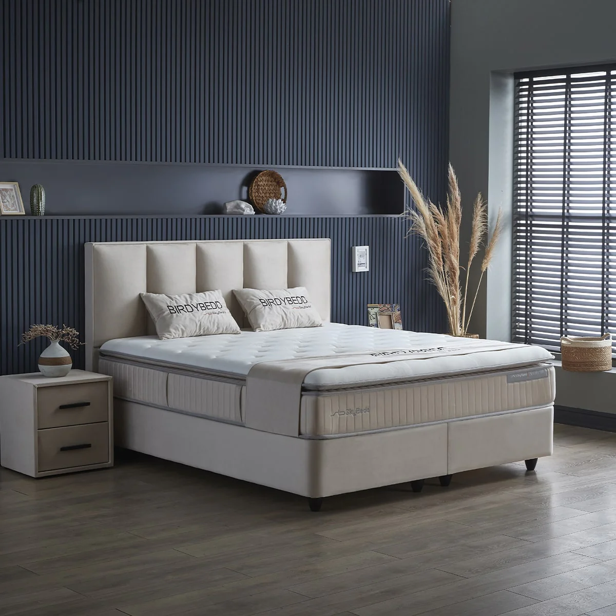 Ontdek onze SkyBedd Orion: een combinatie van premium comfort, kwaliteit en verfijnde elegantie. Deze luxe boxspring wordt geleverd met een handgemaakt hoofdbord en twee ruime opbergcompartimenten. En om het plaatje compleet te maken, kun je bijpassende nachtkastjes bestellen.